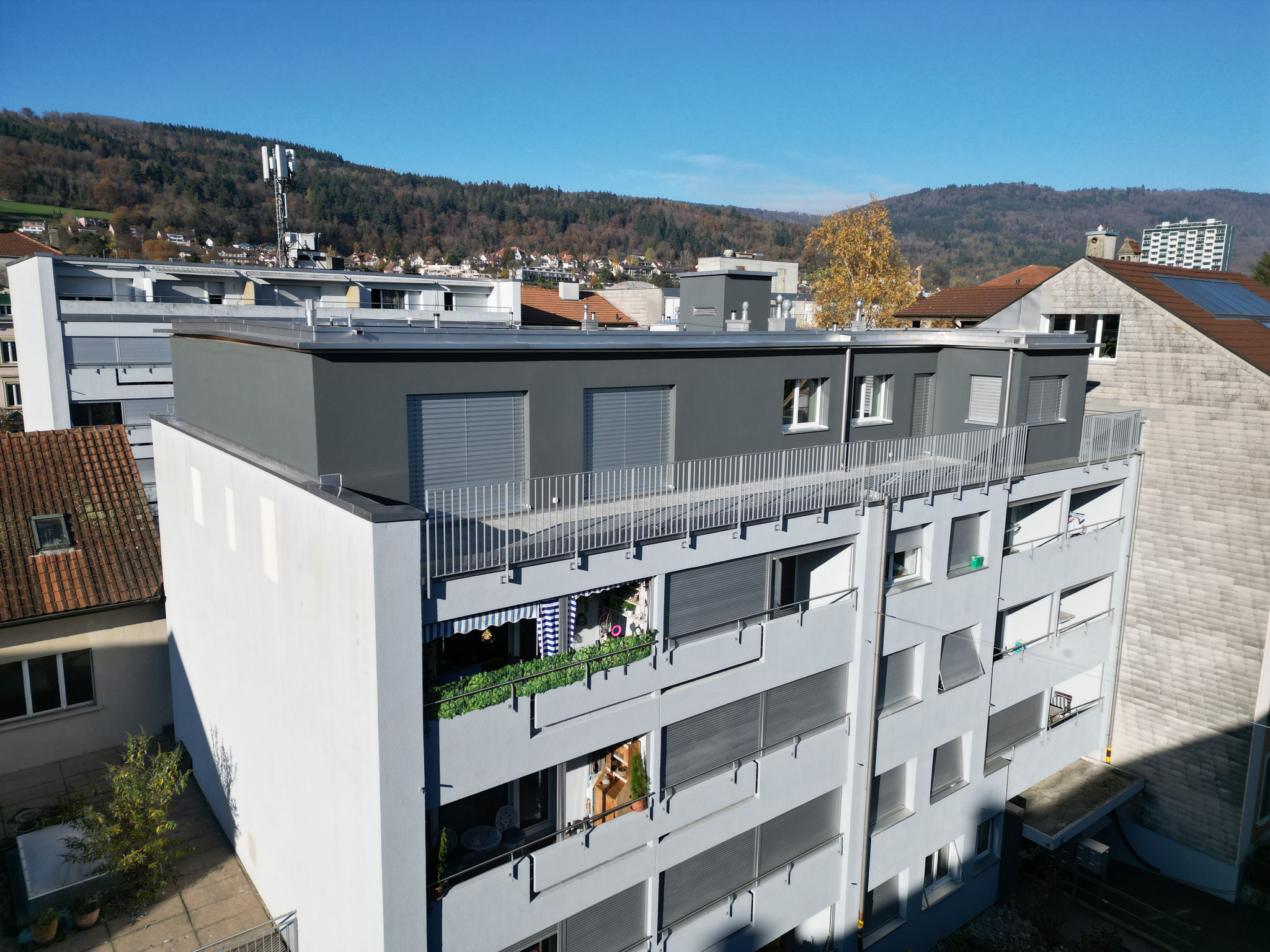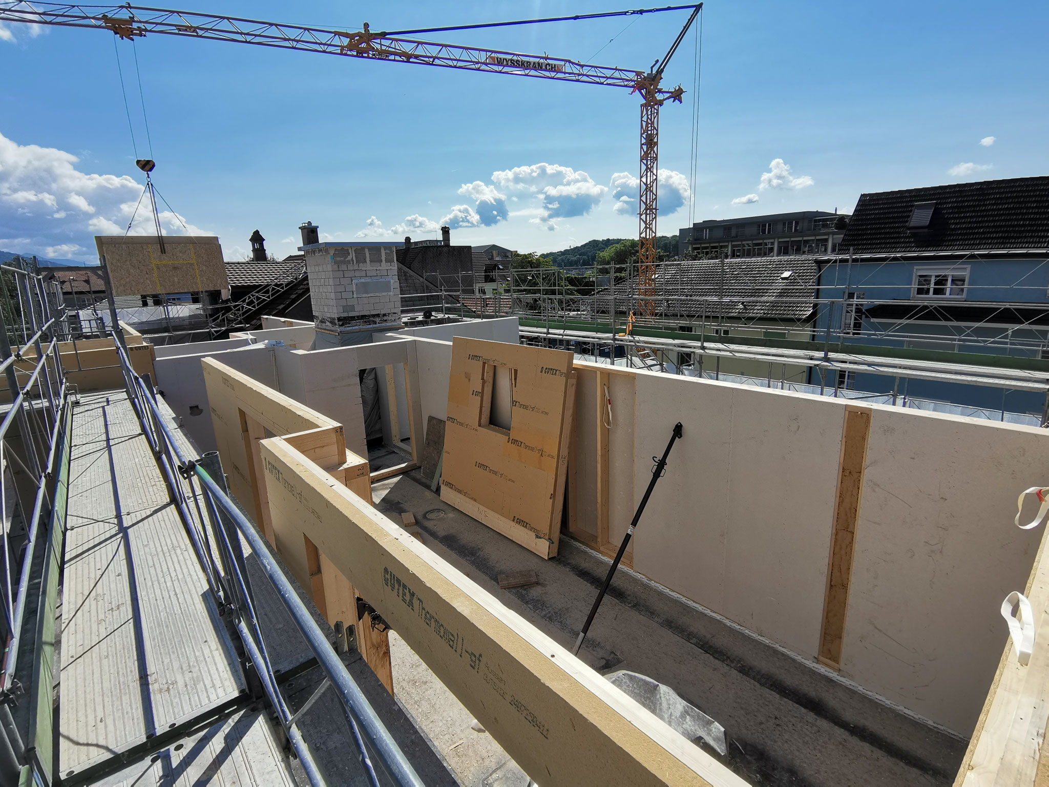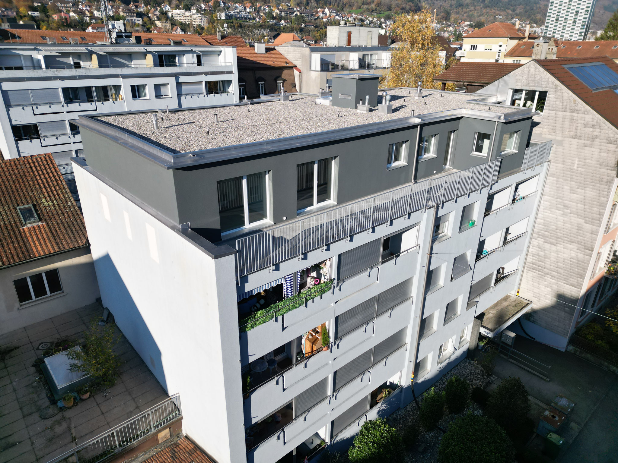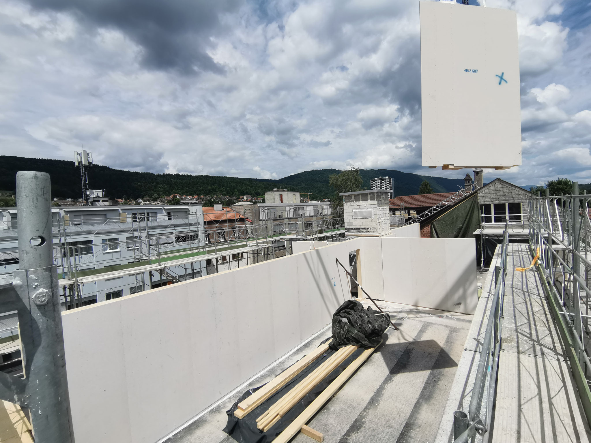 Auf das Flachdach des bestehenden Wohnblocks wird ein 5. Stockwerk in Elementbauweise gebaut. Innert kürzester Bauzeit wird die Aufstockung mit vier neuen Wohneinheiten mit vorgefertigten Wand und Deckenelementen montiert.