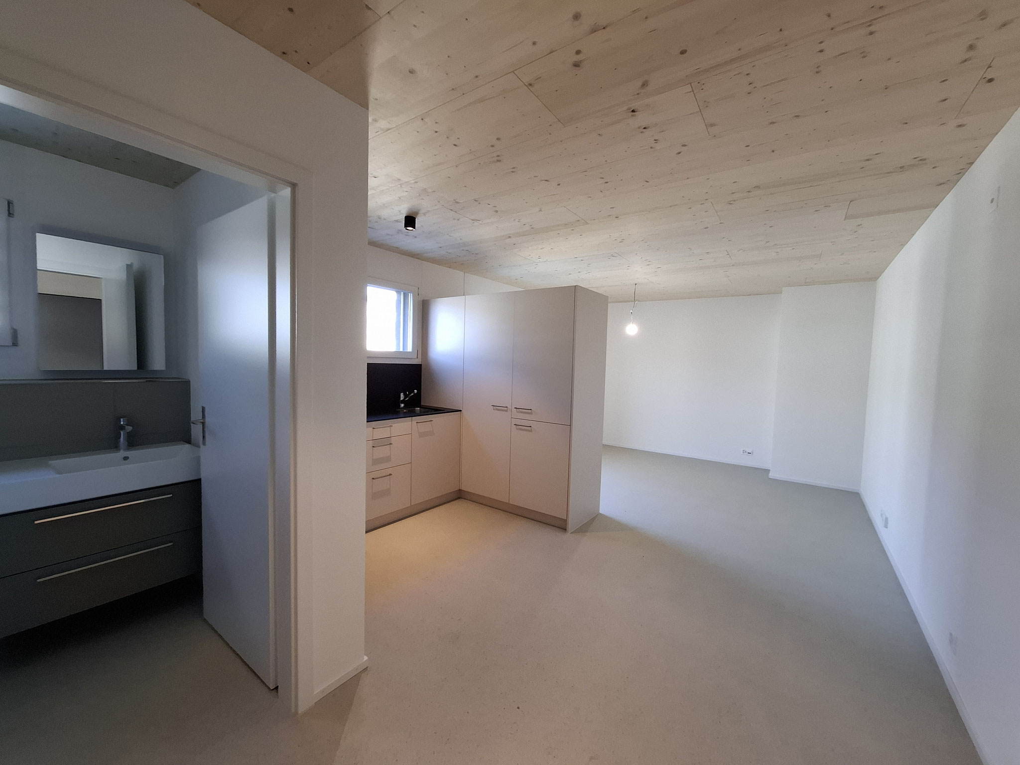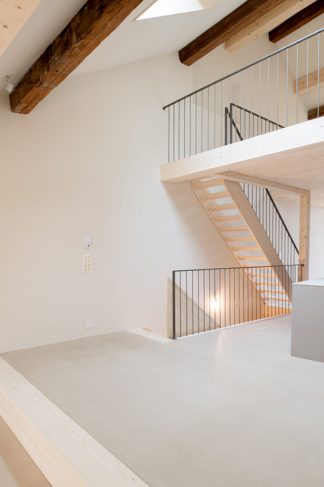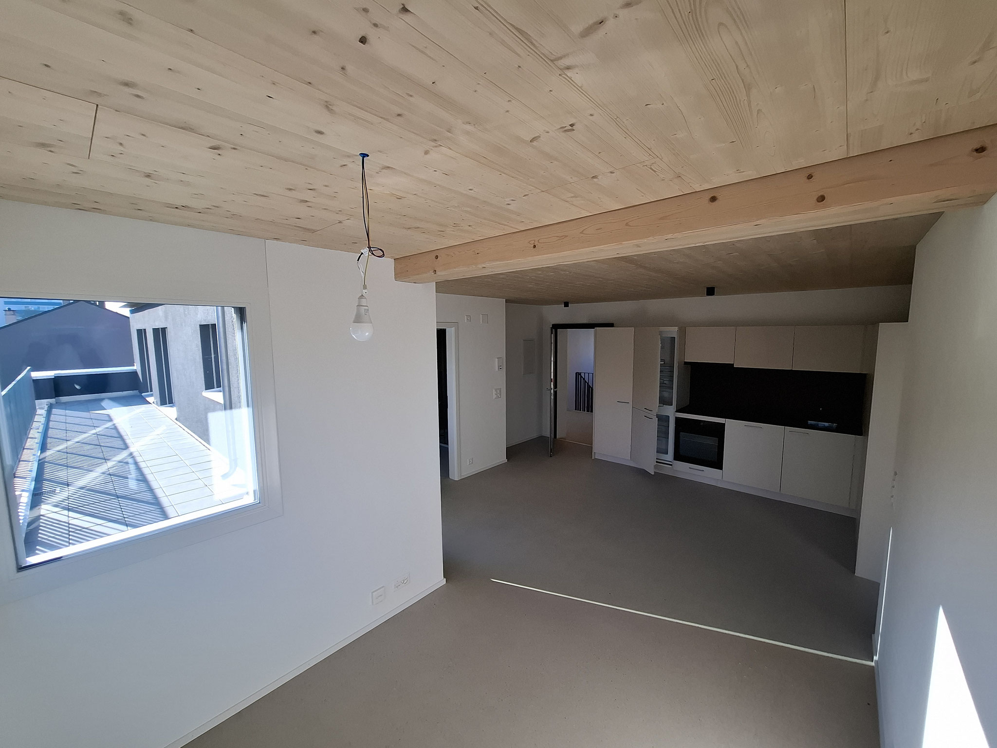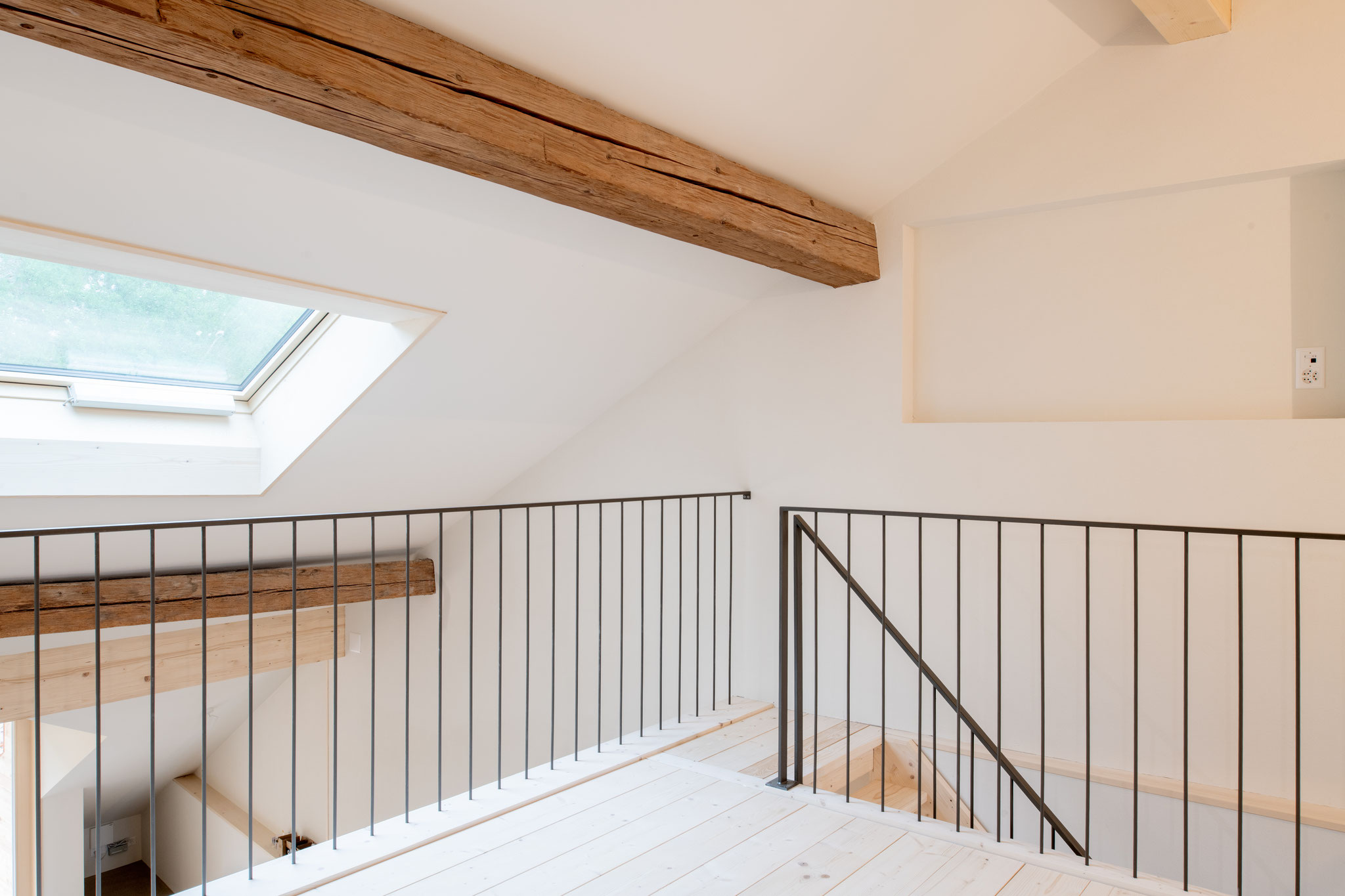 Aus zwei Räumen im Obergeschoss des denkmalgeschützten Stöcklis wurde ein grosser heller Raum gebaut. Der frisch abgeschliffene und geölte Boden lässt den Raum freundlich wirken und die frisch gestrichene Wände tragen zur Helligkeit bei.