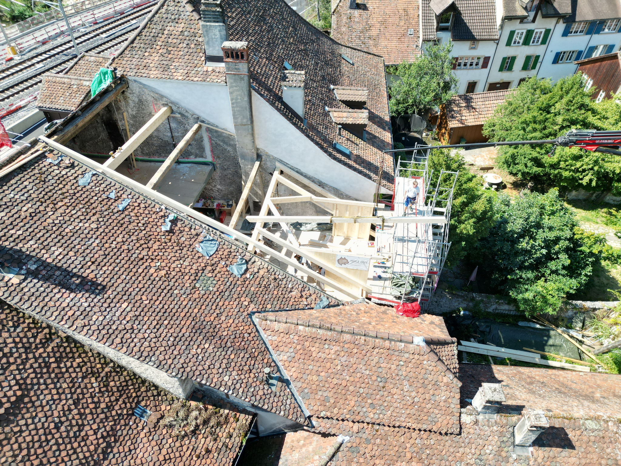 Die Holzkonstruktion wurde nach Mass gefertigt und innert wenigen Tagen in Elementen montiert. Ein Kraneinsatz war dank geschickter Elementierung nicht nötig.