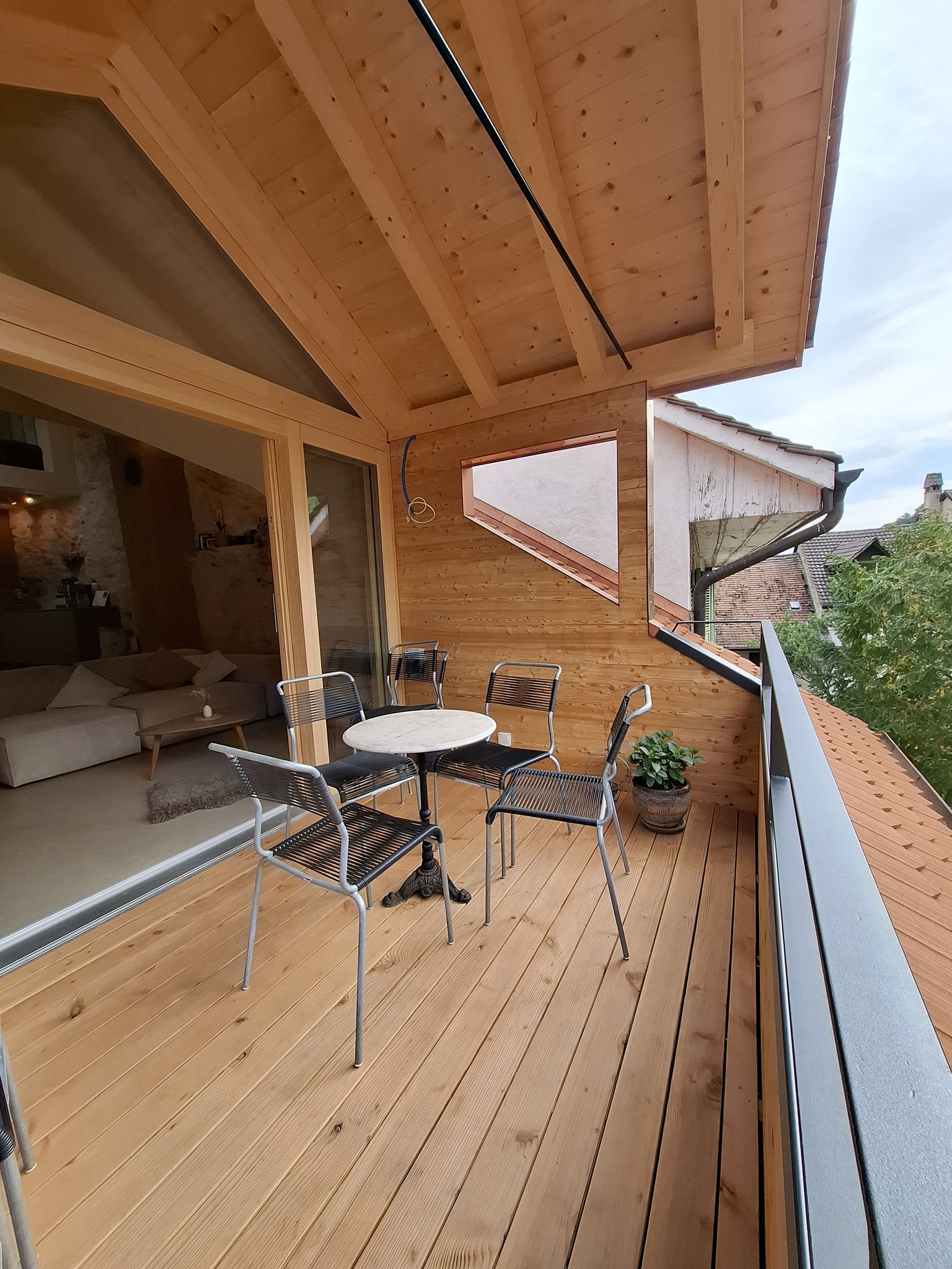 Zur Erweiterung des Wohnraumes wurde beim Einfamilienhaus in Wettingen ein Balkonanbau erstellt. Die tragende Konstruktion besteht aus Stahl und der Boden aus Accoya FSC. Das massgefertigte Geländer und das Flachdachelement besteht aus Holz. Das Design wurde in enger Zusammenarbeit mit den Eigentümmer*innen und der Bauleitung erarbeitet.