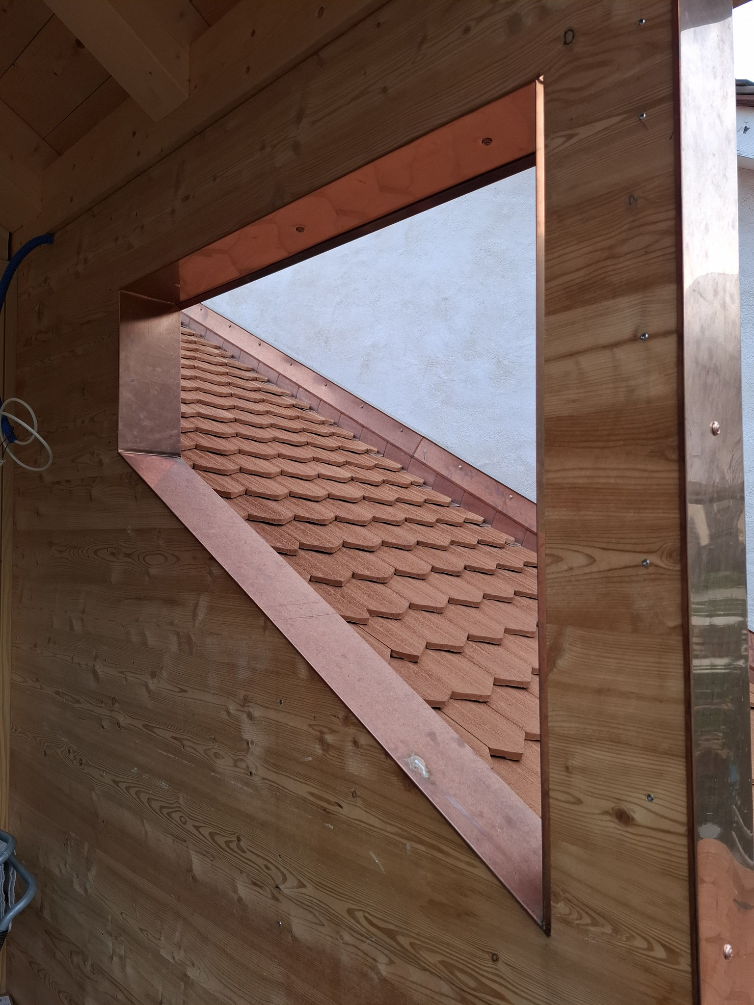 Die Lukarne erweitert das bestehende Badezimmer zu einem kompletten Raum ohne Dachschräge. Durch die grosse Fensterfront und die Dreieck-Fenster in den Wänden wurde ein maximaler Lichteinfall erreicht und das Bad wurde von der dunklen Kammer zum lichtdurchfluteten grosszügigen Zimmer.